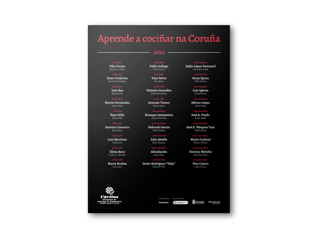 Este mes tuve el placer de realizar el cartel para las jornadas gastronómicas “Aprende a cociñar na Coruña”, colaborando de este modo con una iniciativa impulsada por Cáritas A Coruña que busca elaborar menús saludables con los ingredientes que recibe la institución benéfica. El objetivo de estas jornadas es que las personas inmigrantes que acuden a los centros de Cáritas en Galicia conozcan y aprovechen las posibilidades de los productos que allí se les facilitan.