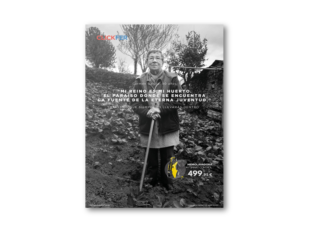 “Sabemos que siempre lo llevarás dentro” es la campaña que desarrollamos el año pasado en Clickfer y que estuvo protagonizada por personas reales del rural gallego de entre 73 y 90 años, poniendo de manifiesto que los clientes de Clickfer son personas que mantienen la pasión por hacer cosas durante toda su vida, permaneciendo activas y con ganas de vivir.